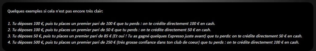 En effet, dès votre inscription finalisée et votre 1er dépôt d’argent validé, placez votre première mise en argent réel sur une rencontre sportive. Si votre pari est perdant, vous serez automatiquement remboursé, en cash retirable, du montant de votre mise, dans la limite de 100€.